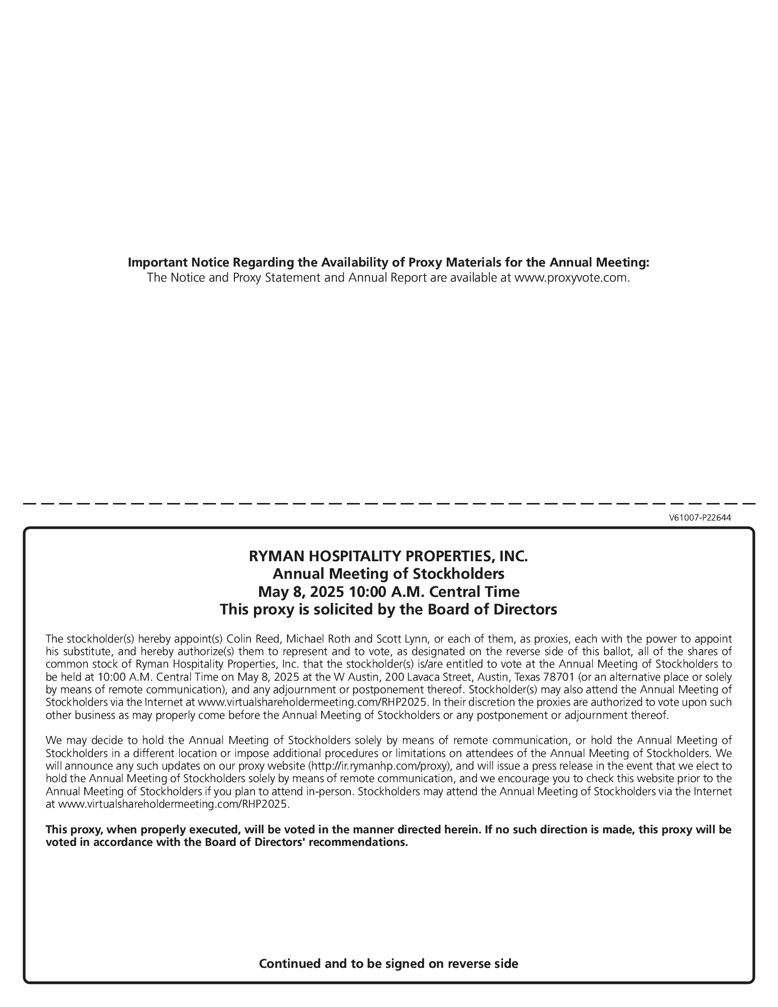 If you wish to submit a question prior to the Annual Meeting, you may do so beginning at 9:00 a.m. eastern time on April 18, 2025, until 11:59 p.m. eastern time on April 25, 2025, by logging into www.proxyvote.com and entering your control number included on your proxy materials. Once past the login screen, click on “Question for Management”, type in your question and click “Submit”. In addition, www.proxyvote.com will re-open for questions beginning at 8:30 a.m. eastern time on May 5, 2025 until 11:59 p.m. eastern time on May 7, 2025. If you would like to submit your question during the Annual Meeting, log into the virtual meeting platform at www.virtualshareholdermeeting.com/RHP2025, type your question into the “Ask a Question” field and click “Submit”.